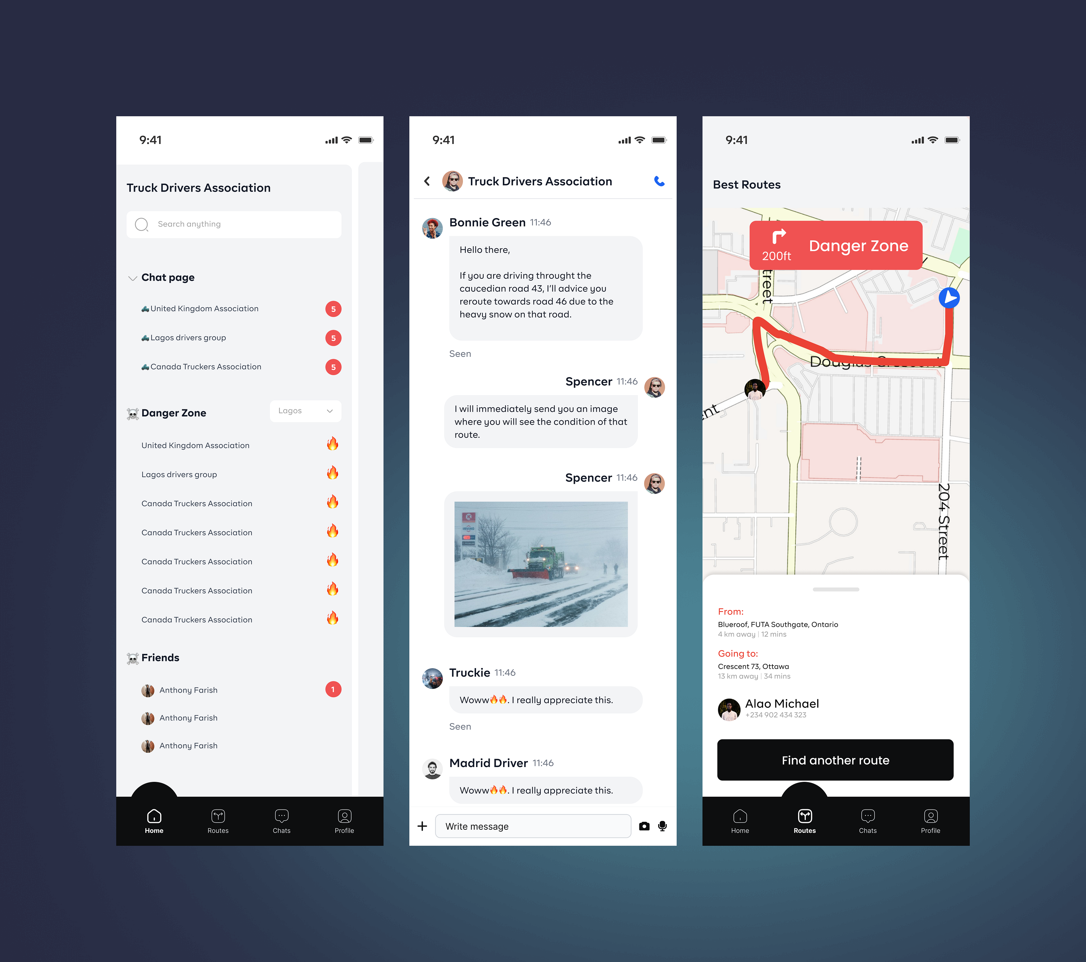 Real-time Route Sharing: Drivers can share the best routes, avoiding bad roads and heavy traffic and Quick access to emergency services and roadside assistance.